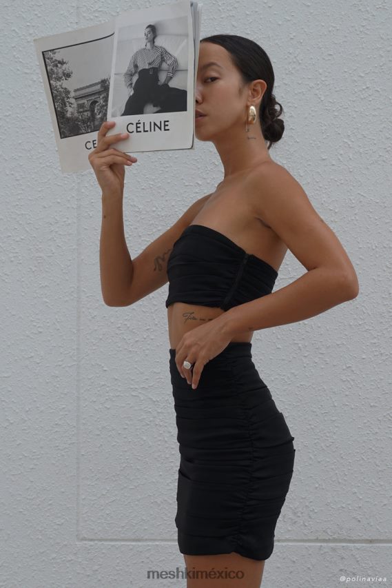 de cerca con lola. Es minimalista pero elevada, muy versátil y le encantan las reuniones sociales. Con un diseño sin tirantes y fruncido en todas partes, Lola se ajusta a su forma y te acompañará de am a pm con facilidad. Está diseñada para combinarla con tus pantalones favoritos o combinarla con nuestra minifalda fruncida Lola. Completa el look con joyas para tu próxima ocasión.
