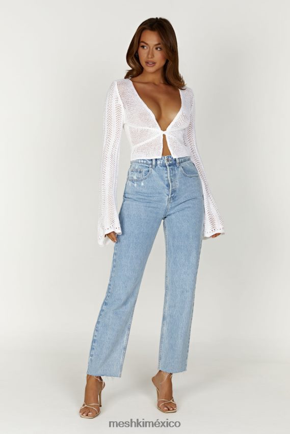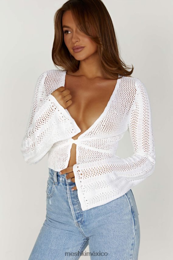 este es un top de manga larga de hilo mixto con paneles de punto empalmados, dobladillos de las mangas acampanados y tejido funcional para anudar. correas para un ajuste personalizado. Sigue el diseño de un cárdigan corto: simétrico, abierto por delante y cerrado con un escote en pico bastante profundo. Las correas de tela anudadas se envuelven alrededor del torso y se anudan en la espalda, creando un efecto ceñidor en la cintura que complementa las mangas ajustadas. La confección de hilo de punto empalmado es solo semitransparente, lo que significa que puedes usarlo con empanadas o un sostén de encaje y aún así disfrutar de la cobertura.