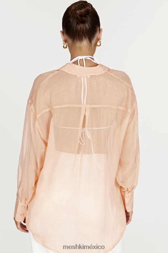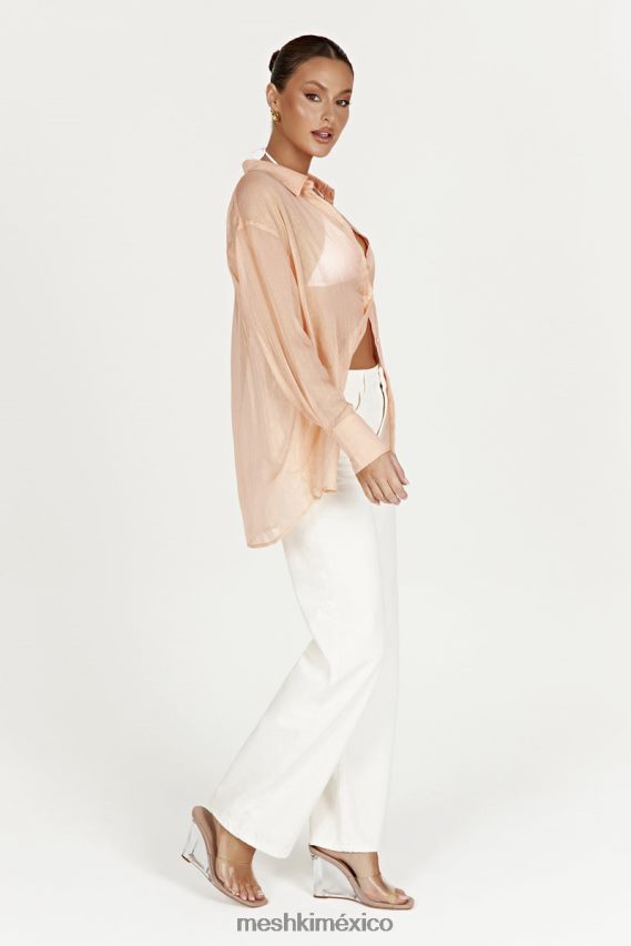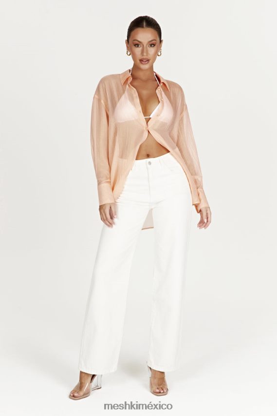 Vaya al grano con la camisa iridiscente transparente de gran tamaño de Molly. Como su nombre lo indica, nos encanta que sea lo suficientemente transparente como para usarlo sobre cultivos, bandeaus o bralettes, pero el estilo con cuello abotonado se siente elegante y formal. todos en meshki hq combinan esto con un par de jeans clásicos (como nuestros jeans tina mom) para una apariencia fresca pero informal para el día.