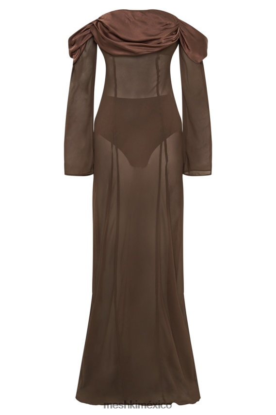 IVANNA is a low, off-shoulder maxi dress with a tucked waistline, long sleeves, and a sexy mesh-blend fabrication. Slinky and see-through, this dress highlights the neck and shoulders using strategic design elements. The neckline is a straight, off-the-shoulder affair that bunches around the chest, drawing attention to that area. The sleeves are dramatically long - effectively hiding arm and hand - and the skirt hem, too, falls well past the feet to pool on the floor. The custom mesh fabrication further flatters your figure by being both teasing and slightly curve-hugging. A truly different and eye-catching dress, let Ivanna take the spotlight by pairing it with a delicate clutch and some nude heels like our Fleur Thin Strap High Heels.