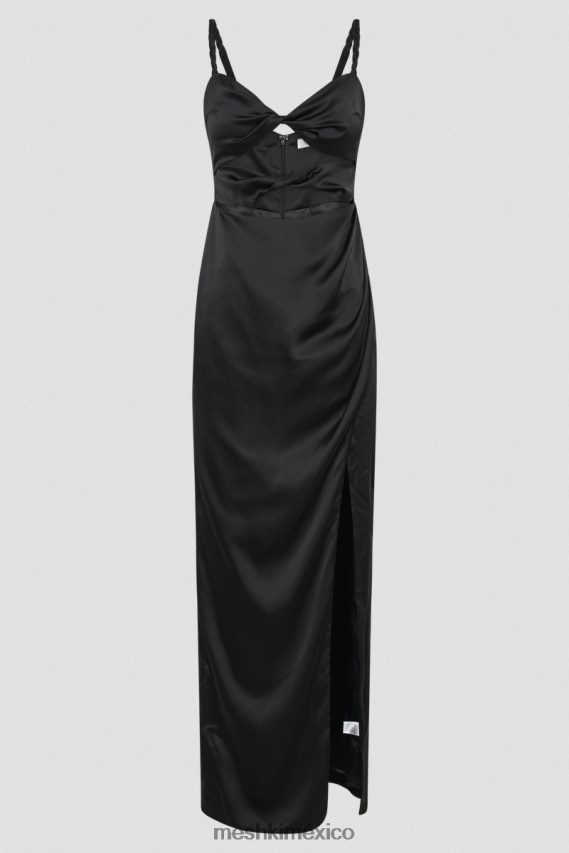 cleo es un sexy vestido negro satinado, sin mangas, con escote corazón y tirantes ajustables. las copas del busto están ligeramente fruncidas y torcidas en el centro con una línea trasera en el centro que se cierra mediante una cremallera estándar de gancho y ojo. un panel de corpiño retorcido se ubica justo debajo de las copas del busto para crear una especie de apariencia de corte personalizado, mientras que la falda larga tiene una abertura en la parte delantera y tres pliegues en la costura lateral para crear una apariencia drapeada. Los tirantes de los hombros son finos y trenzados en la parte delantera, lo que añade textura visual al vestido.
