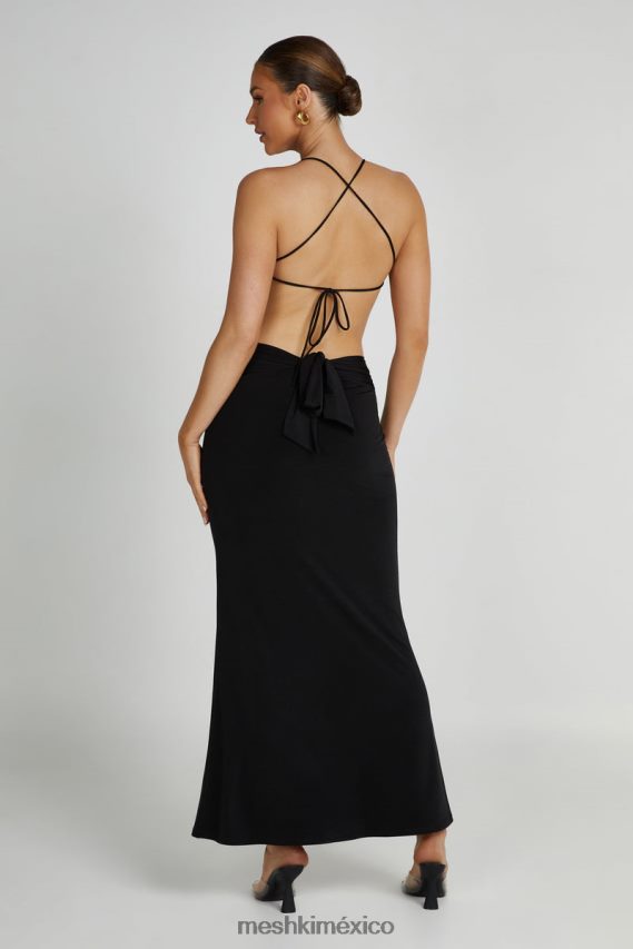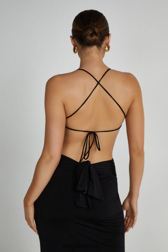 el indiana es un vestido largo negro ceñido que presenta un escote en V pronunciado en la parte delantera que resalta tu escote, así como un escote entrecruzado ajustable. -tiras cruzadas en la parte posterior para brindar un ajuste personalizable que también crea un detalle llamativo que enmarca maravillosamente tus hombros. Para darle un toque adicional de intriga, este vestido presenta recortes estratégicamente ubicados a los lados. Estos elegantes recortes ofrecen destellos de piel, añadiendo modernidad y toque al clásico vestido largo.