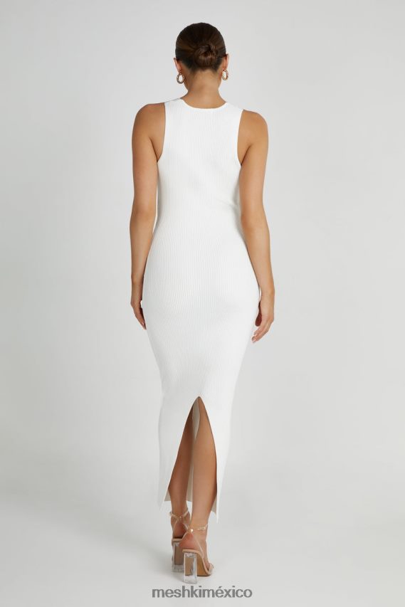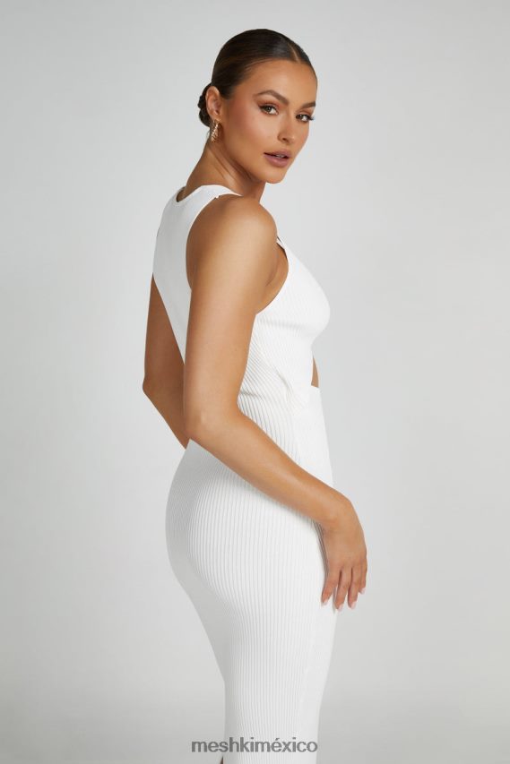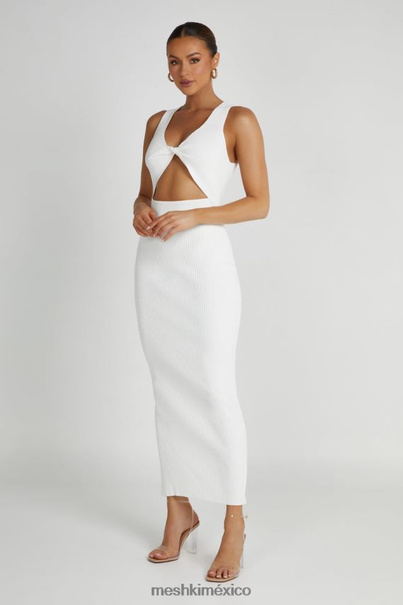 kaesha es un vestido de punto sin mangas con tirantes anchos, un escote en V profundo y un gran corte triangular alrededor del torso inferior. su falda tiene un corte ajustado y de largo maxi que abraza las curvas y cae hasta los tobillos en un dobladillo recto. La fabricación de punto meshki personalizada le permite estirarse y amoldarse a su cuerpo sin perder su forma original. el nudo central retorcido añade otro nivel de detalle visual que hace que este vestido llame la atención.