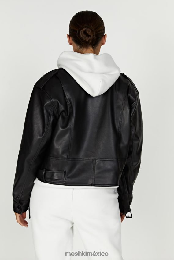 las chaquetas de cuero, especialmente las de cuero sintético , siempre lucirán casualmente geniales. Kirby no es diferente. Sigue el corte clásico de motocicleta: mangas largas y rectas, corte ligeramente recortado, solapas anchas y herrajes a juego para una estética limpia. y, por supuesto, muchas correas y hebillas. la parte delantera se cierra con cremallera hasta menos de la mitad, lo que da como resultado una especie de escote en V profundo cuando la chaqueta está cerrada. Los hombros anchos se deben a las charreteras y las hombreras internas.